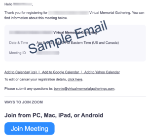 Just like in a physical service, you will be in the audience and you can watch and listen, but won’t be able to participate during the formal part of the service. If the family has selected the open mic option there will be a sharing time when can participate. If this option is being included you will be notified by the moderator during the service and given instructions on how to participate.